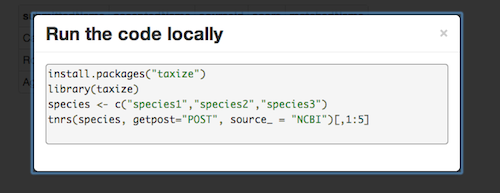 We didn’t originally have a tab for searching for mentions of taxonomic names in the literature - we added it in later (see the Papers tab on the app), and people really liked it, suggesting that’s something we should explore more. How does it work? We take the list of taxonomic names input in the text box in the upper left, and query the PLOS search API, and return a table of papers listing the journal name and paper title. We provide a link to open an article from the search results in Macrodocs (thx @invisiblecomma!), like this example. We chose PLOS as they have a relatively large set of articles, and they are all open access = immediate access to the text. Any interest in an app just for literature? Maybe litereature + metadata? And perhaps some text mining using the tm package?