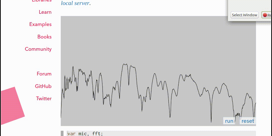 I searched for a graphic equaliser javascript library to work with and didn’t find much that aligned with what I had in my head. Eventually I stumbled on p5.js and its examples page which has an audio-input plot with a live demo. It’s a frequency spectrum, but I figured that’s just a bit of binning away from what I need. Running the example there looks like