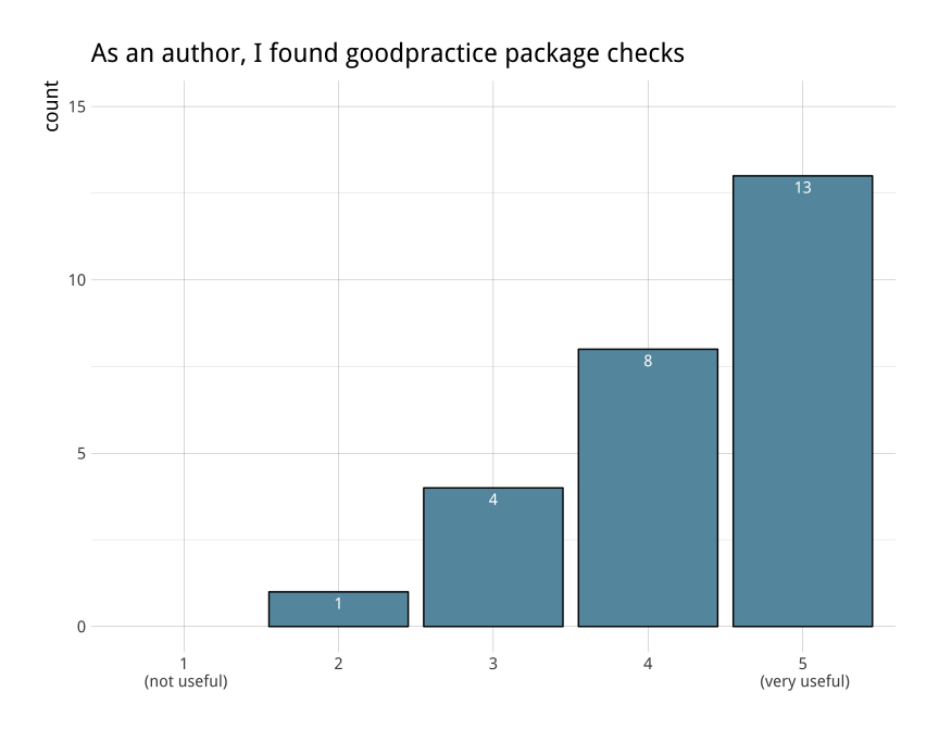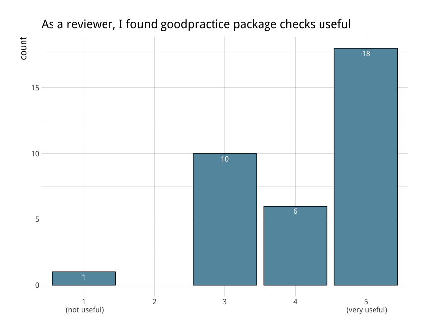We received specific feedback about our use of the goodpractice package to provide automated checks of some package quality issues. Respondents suggested that authors should pre-run these checks before submitting, and also to provide better guidance as to which outputs can be ignored. We’re adding both suggestions to the new bookdown book.