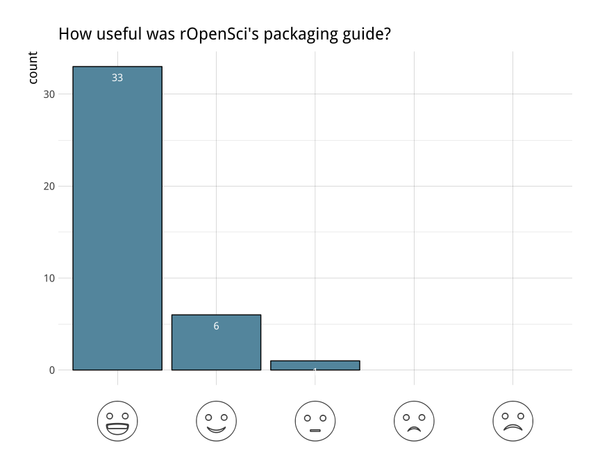 For the packaging guide, authors gave feedback that they could be better organized, including a suggestion that the collection of markdown files be converted to a bookdown website for easier navigation. We thought this was a great suggestion, and have begun the process of porting all our documentation for packaging and reviewing, into a common bookdown book. Editor Maëlle Salmon is leading this work, and you can find the in-progress book, rOpenSci Packages: Development, Maintenance, and Peer Review.