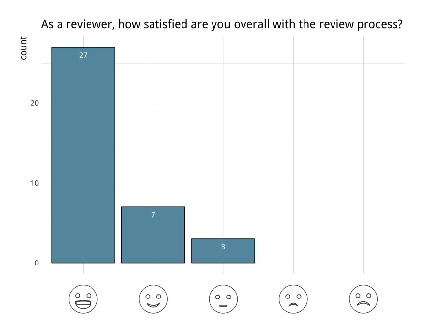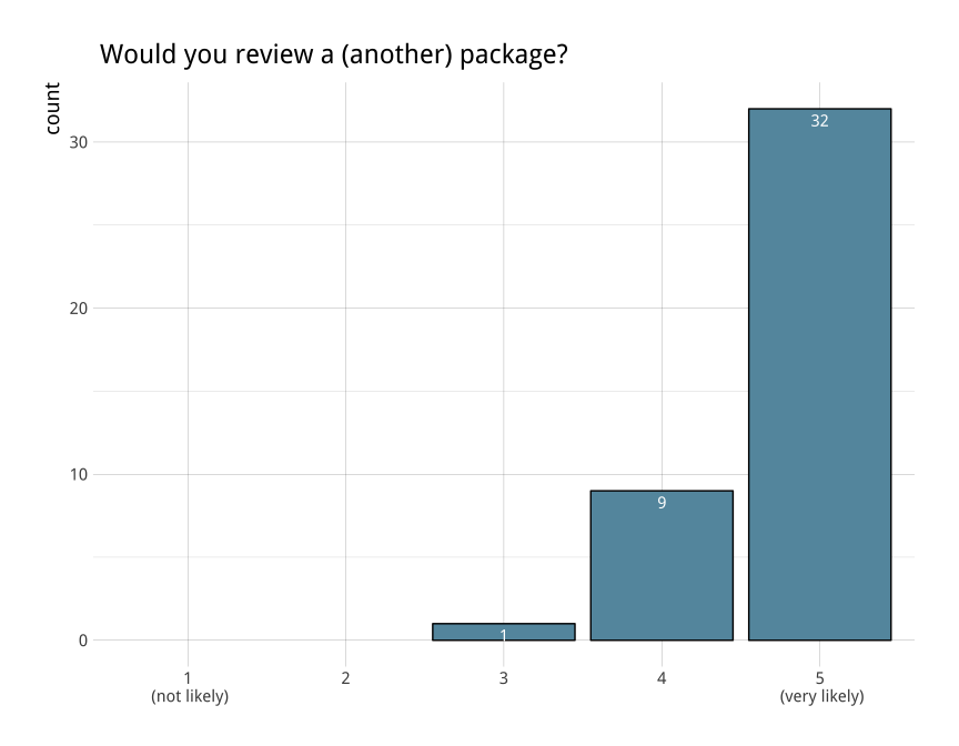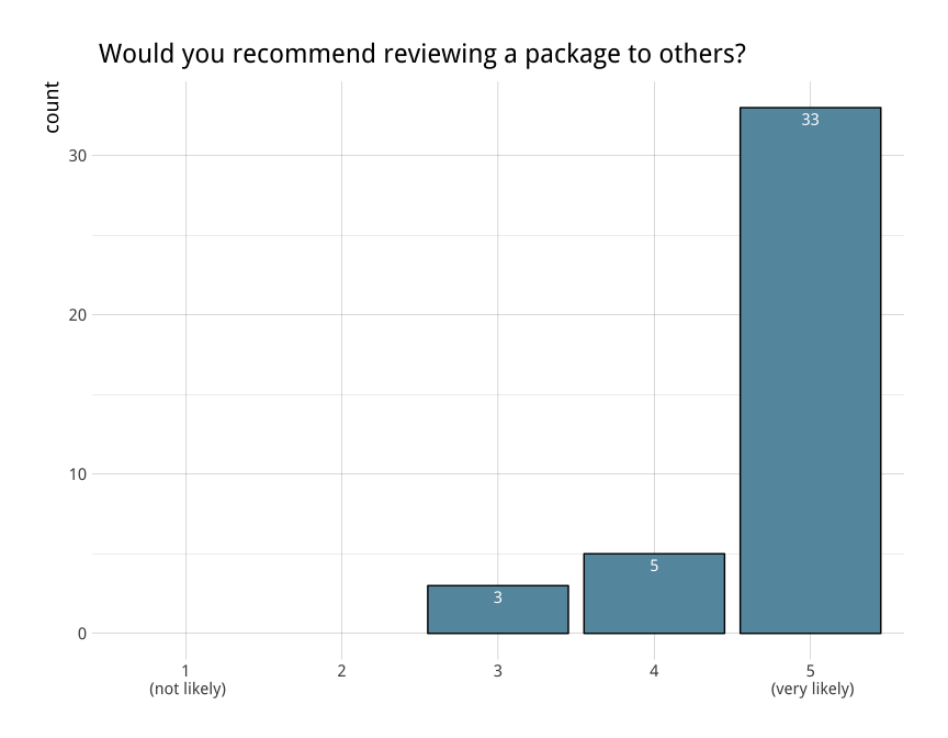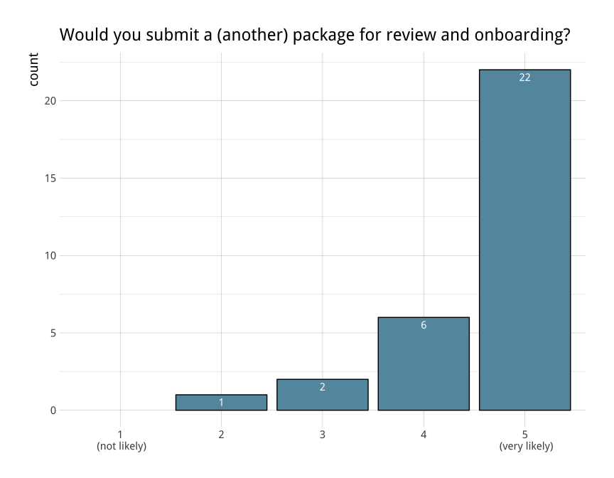 rOpenSci’s package review system (aka onboarding) is one of our key activities to improve quality and sustainability of scientific R packages. The editorial team are constantly working towards improving the experience for both authors and reviewers. After our first year, we surveyed authors and reviewers who participated in our onboarding process to help us better understand what’s working well and where there is room for improvement. At the end of last year, we did so again, re-designing our survey so as to better track participant opinions year-to-year. In this post we summarize the 45 responses that we received and what we’re doing to address your feedback.