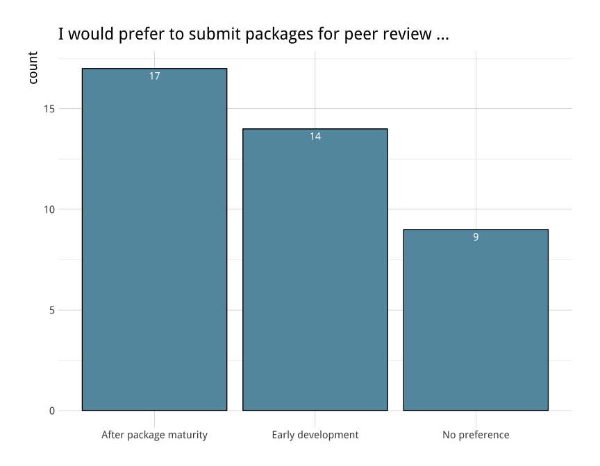 This was perhaps the most controversial topic in the responses. Both authors and reviewers were conflicted about the best time to submit for review. Submitting early in development could allow reviewers to provide concrete feedback on software design and usability, but it is generally hard to review incomplete software. On the other extreme, software that is mature and already on CRAN may not be able to implement reviewer suggestions, especially if it would result in breaking changes for users. One suggestion was to consider packages in both stages and provide short (less than one hour of review) for early stage packages and reserve the more detailed reviews for the mature packages.