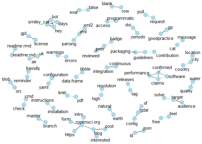 In the meantime, I’ve now only submitted and reviewed a few packages but also become an associate editor. In general, when one of us editors talks about onboarding, we like to use examples illustrating the system in a good light: often excerpts from review processes, or quotes of tweets by authors or reviewers. Would there be a more quantitative way for us to support our promotion efforts? In this blog post, I shall explore how a tidytext analysis of review processes (via their GitHub threads) might help us characterize the social weather of onboarding.