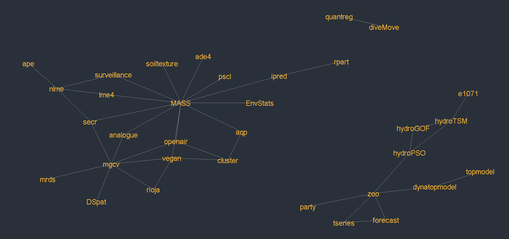 While there are clearly fewer connections than in the tidyverse package ecosystem, there is still quite a large amount of connectivity in Environmetrics task view In particular the mgcv, MASS, vegan and zoo packages all provide critical infrastructure for those developing packages in this field. This presumably can at least partially be attributed to the age (and therefore the maturity) of the Environmetrics task view.