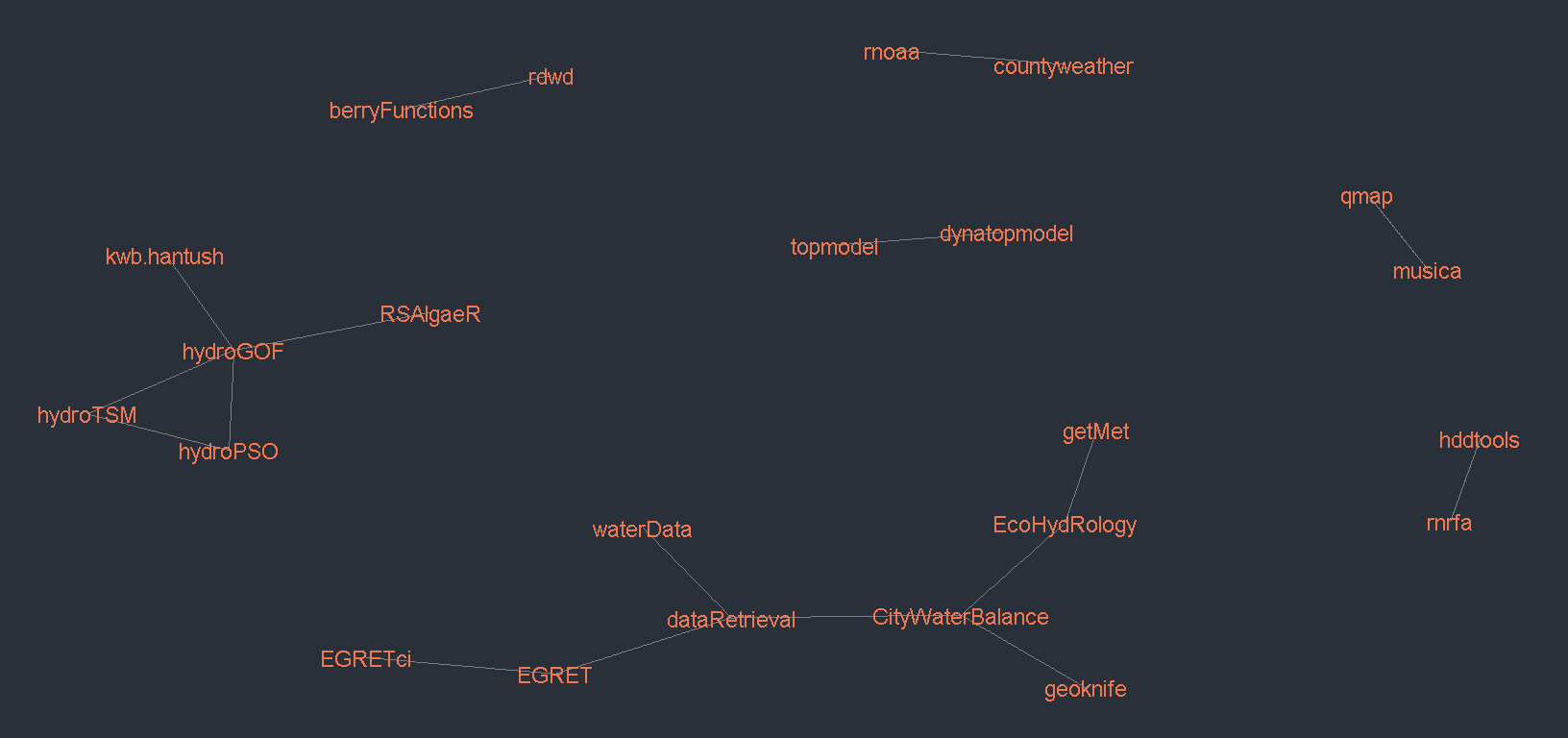 We will conduct a high-level assessment of the state of hydrology in R by visualizing network connectivity among package dependencies – which packages use code from another package to accomplish a task. For context, we will evaluate our Hydrology task view against one of the most well-known collection of packages in R, the tidyverse, as well as the venerable Environmetrics task view which includes many packages for environmental analysis. To do that we need to write some R code and load our required packages: