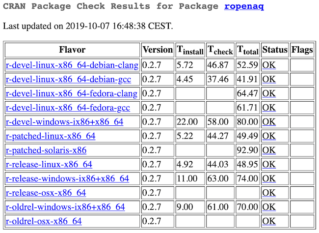 If you have an R package on CRAN, you probably know about CRAN checks. Each package on CRAN, that is not archived on CRAN1, has a checks page, like this one for ropenaq: