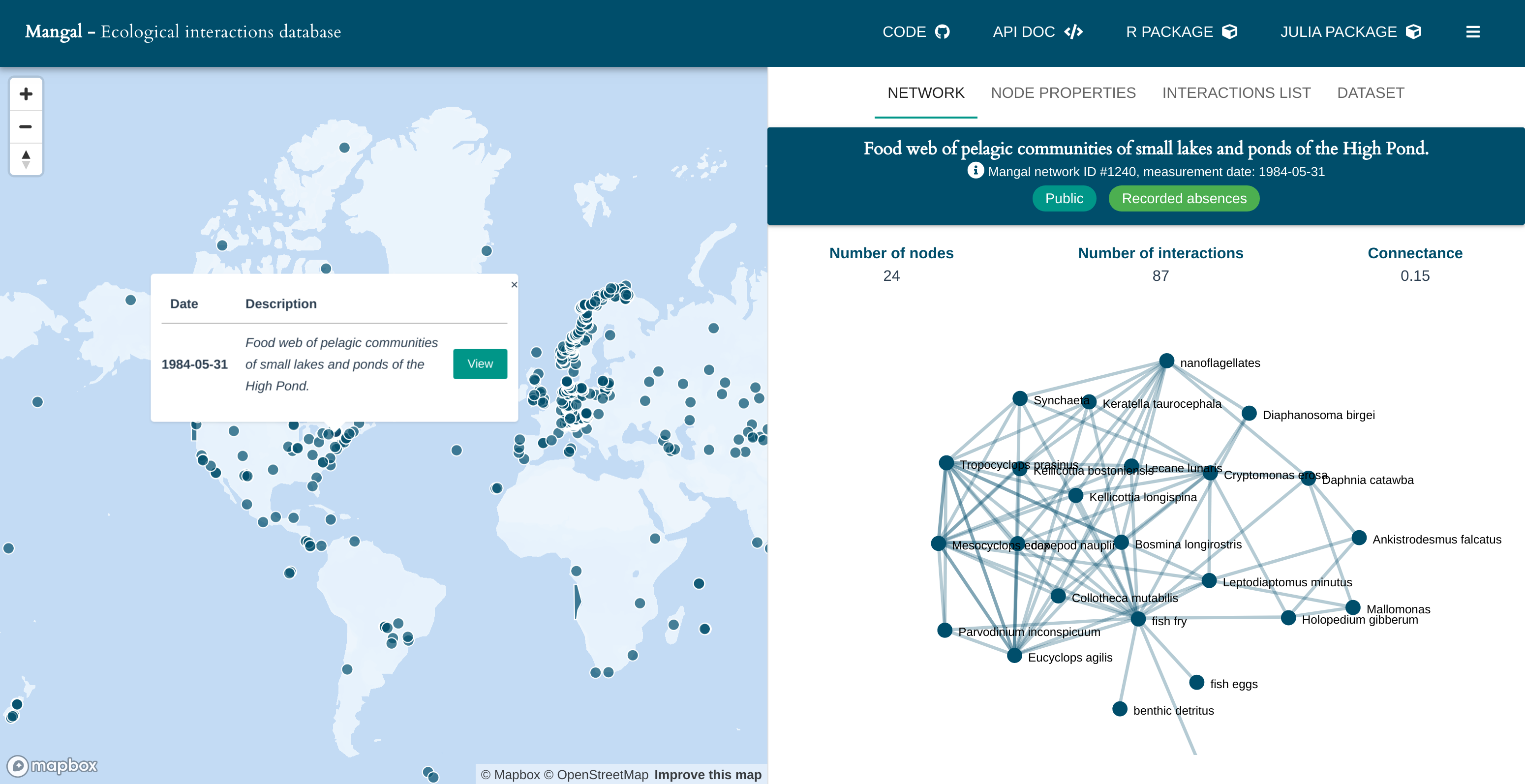 Recording and properly storing these interactions help ecologists to better understand ecosystems. That is why they are currently compiling datasets to explore how species associations vary over environmental gradients and how species lost might affect ecosystem functioning. This fundamental research question should help us understanding how ecological networks will respond to global change. To this end, the Mangal project https://mangal.io/#/ standardizes ecological networks and eases their access. Every dataset contains a collection of networks described in a specific reference (a scientific publication, a book, etc.). For every network included in the database, Mangal includes all the species names and several taxonomic identifiers (gbif, eol, tsn etc.) as well as all interactions and their types. Currently, Mangal includes 172 datasets, which represents over 1300 ecological networks distributed worldwide.