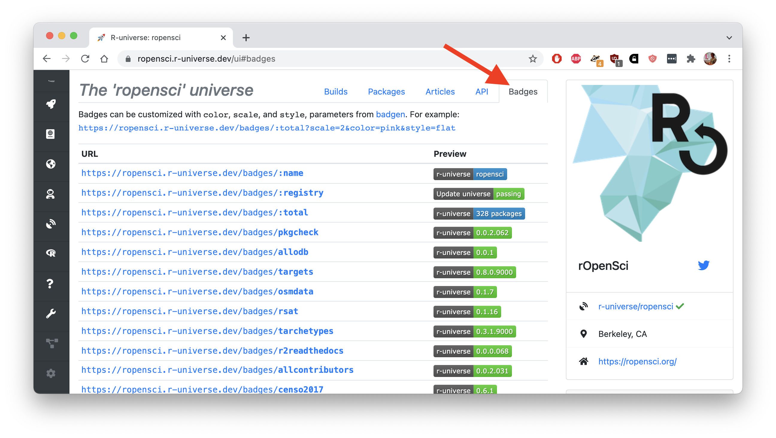 After creating your personal universe, the dashboard on https://{yourname}.r-universe.dev shows the version and other details for each package in your repository. We have also added a new tab that lists the available badges for the repository.