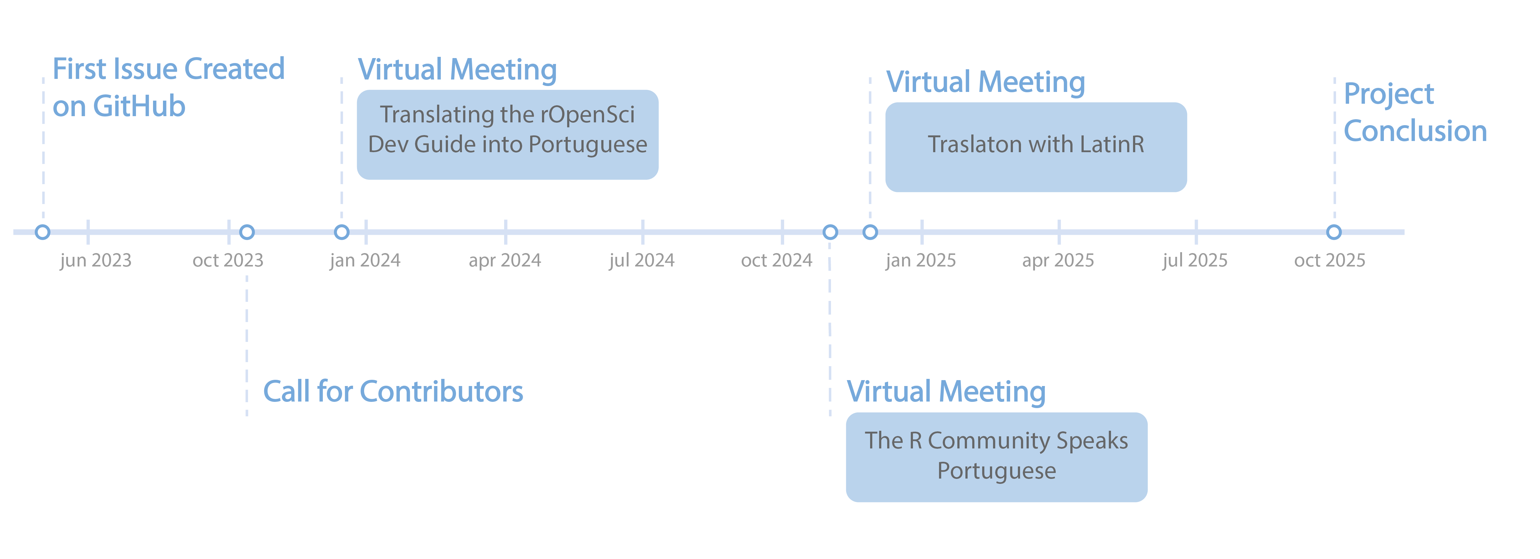 Initially, the Dev Guide was created in English and later gained a Spanish version, thanks to a community-driven translation effort. More recently, a group of collaborators worked together to translate the Dev Guide into Portuguese. In this post, we describe how this collaborative translation process unfolded, recognizing that translating resources is one way to contribute to rOpenSci’s mission of fostering a culture of open and reproducible research.