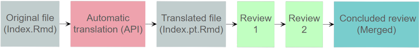 All tasks related to the Portuguese translation were organized on GitHub, in the Dev Guide repository. The Dev Guide is written in R Markdown, with each chapter stored in a separate .Rmd file. Each original English chapter was first automatically translated using the {babeldown} package1. This package, part of the rOpenSci collection, relies on the DeepL API, an AI-powered translation tool.